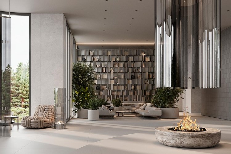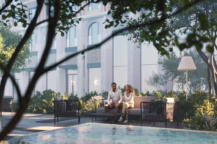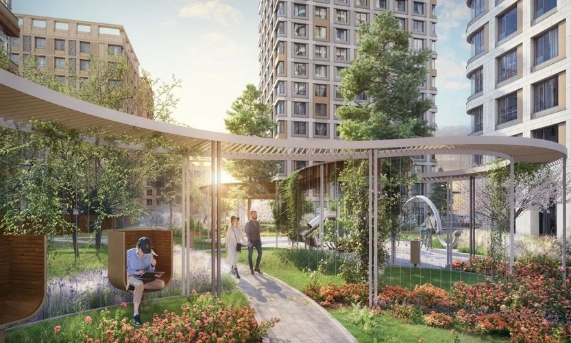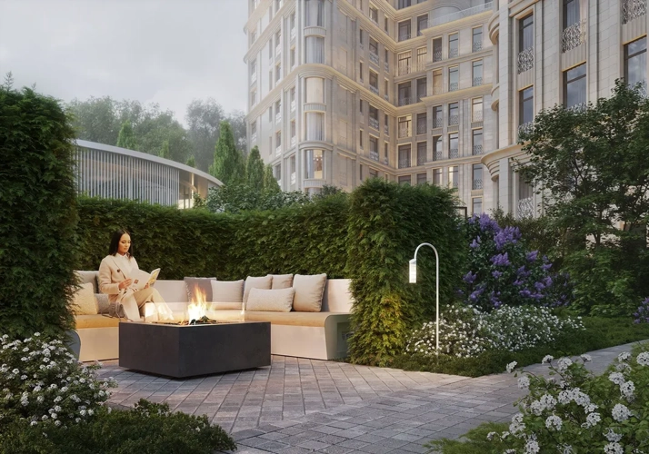 Двор комплекса создан как закрытый клубный сад. Никакого шума и машин — только тишина, зелёные насаждения, уютные дорожки и скамейки, где можно отдохнуть в одиночестве или провести время с близкими. Вечером мягкая подсветка превращает двор в камерное пространство, где приятно задержаться после насыщенного дня.