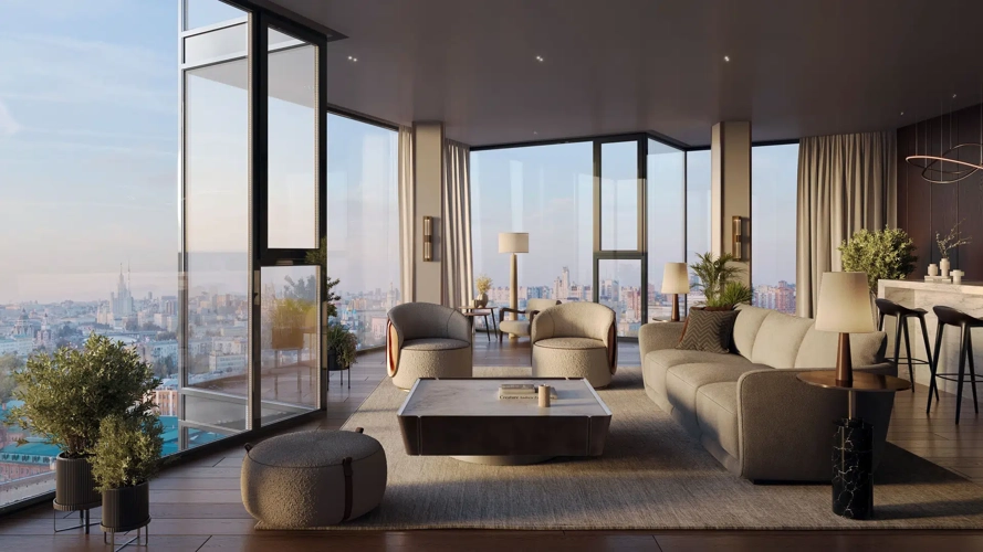 Подойдите к панорамному окну — и перед вами открывается Москва во всей своей красоте. Утром — золотой свет над рекой и парками, днём — динамика столицы, а вечером город сияет тысячами огней. Этот вид становится вашим личным источником вдохновения и гордости.